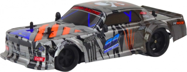 Caroseria gri cu accente portocalii și inscripții de curse oferă mașinii un aspect autentic. Profilul coborât și roțile late susțin stabilitatea la viteze mai mari.