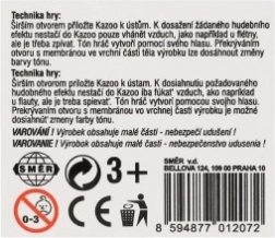 Construcția din plastic este durabilă, iar datorită lungimii de 12 cm, kazoo-ul se transportă ușor în buzunar sau rucsac.