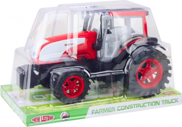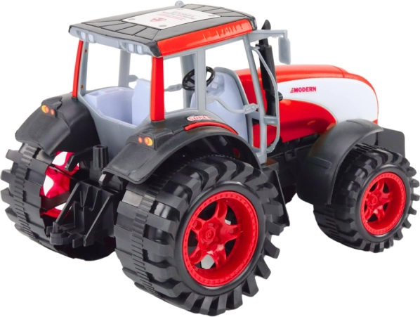 Cabină detaliată, roți masive și culoare roșie contrastantă oferă un aspect autentic al unui tractor adevărat.
