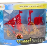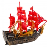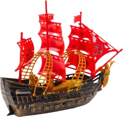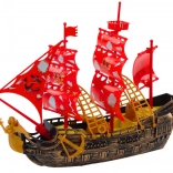 Nava se remarcă prin lateralele brun-aurii, care îi conferă un aspect elegant și autentic, demn de adevăratele nave pirați din vremuri trecute. Îmbogățită cu catarge roșii pe care flutură însemne piraterești, atrage atenția și completează atmosfera aventurilor maritime pline de mister. Datorită acestor detalii, jucăria arată ca o navă reală, pregătită să cucerească mările și oceanele.