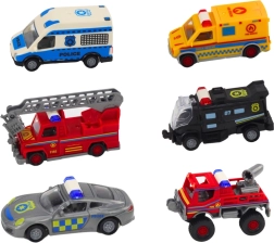 Setul conține șase vehicule, inclusiv de poliție, pompieri și ambulanță, pentru situații de joacă realiste.