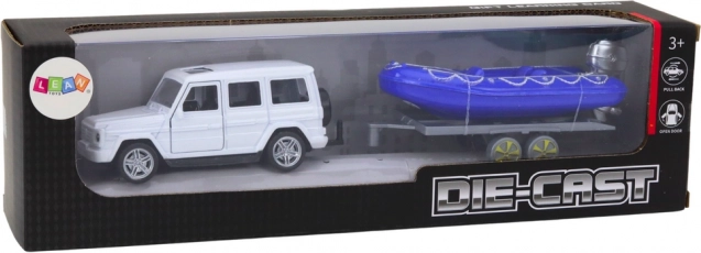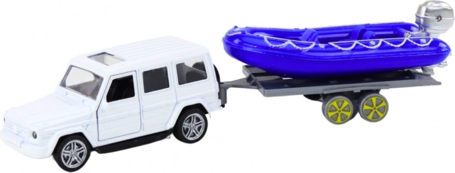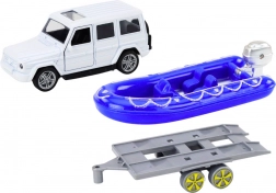 Bucurați-vă de aventuri palpitante cu mașina de teren și barca cu motor albastră! Acest model metalic oferă detalii precise, inclusiv uși care se deschid, în care copiii pot plasa figurinele șoferului și pasagerilor.