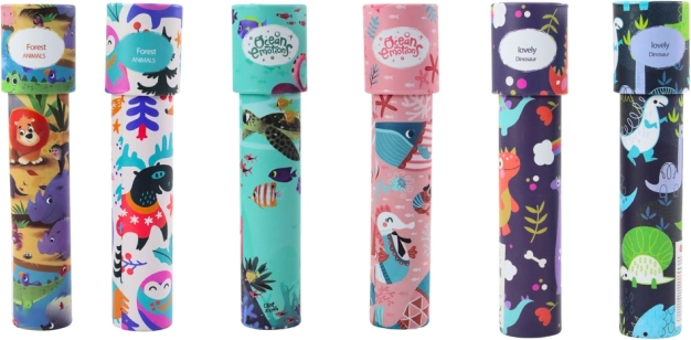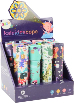 Când copilul privește prin caleidoscop și rotește tubul, apar modele simetrice în continuă schimbare, pline de culori intense. Fiecare rotire aduce o nouă combinație de forme și nuanțe, care atrage atenția și stimulează imaginația. Motivele colorate de pe ambalaj fac din caleidoscop o jucărie atrăgătoare și o idee de cadou.