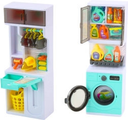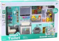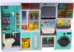 Dușul cu toaletă, lavoarul cu oglindă, mașina de spălat cu dulăpior și rafturile cu masă de călcat formează un ansamblu de joacă complet pentru un joc variat de-a gospodăria.