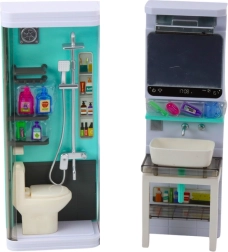 Acest set bine gândit este format din 4 segmente interconectate: cabină de duș cu toaletă, lavoar cu oglindă, mașină de spălat cu dulăpior și rafturi cu masă de călcat. Designul turcoaz‑alb și execuția precisă susțin imaginația și îi motivează pe copii să imite activitățile cotidiene. Dimensiunile ansamblului 35 × 26 × 8 cm se potrivesc perfect în camera copilului sau lângă căsuța pentru păpuși.