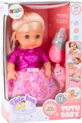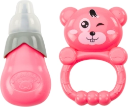 Păpușa emite sunete delicate care imită un bebeluș, dezvoltând imaginația și abilitățile sociale ale copiilor. Pachetul este completat de o zornăitoare ce susține motricitatea fină și percepția senzorială.