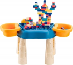 Măsuța are o suprafață specială pe care copiii pot construi diverse structuri din cuburi colorate.