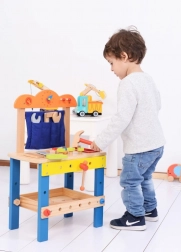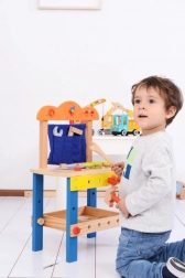 Datorită dimensiunilor compacte și înălțimii de 34 cm până la blatul de lucru, atelierul este ideal pentru camera copiilor. Este realizat din lemn și vine cu un set bogat de unelte care stimulează autonomia, răbdarea și gândirea logică.
