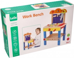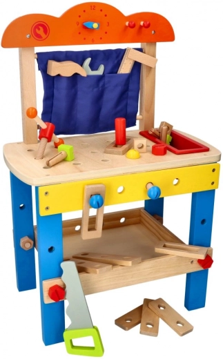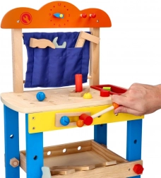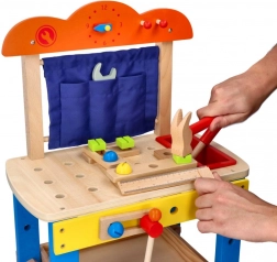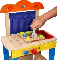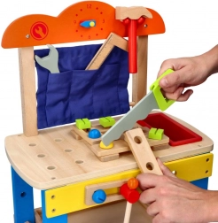 Acest atelier de lucru din lemn, de înaltă calitate, este conceput pentru a-i familiariza pe copii în siguranță cu lumea uneltelor. Elementele colorate, piesele funcționale precum șuruburi, piulițe și roți dințate, precum și compartimentul practic pentru instrumente susțin curiozitatea naturală și dezvoltarea abilităților.
