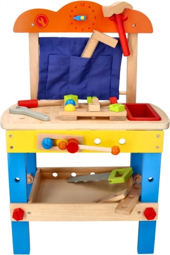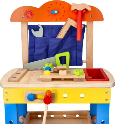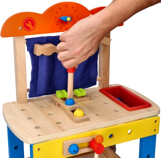 Acest atelier de lucru din lemn, de înaltă calitate, este conceput pentru a-i familiariza pe copii în siguranță cu lumea uneltelor. Elementele colorate, piesele funcționale precum șuruburi, piulițe și roți dințate, precum și compartimentul practic pentru instrumente susțin curiozitatea naturală și dezvoltarea abilităților.