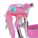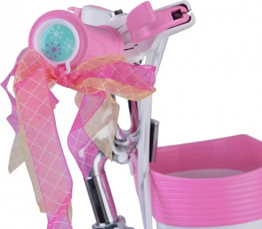 Ghidonul ergonomic cu mansoane moi, clopoțel și ciucuri va încânta micile cicliste, în timp ce combinația de frână față pe jantă și frână spate pe tambur oferă o frânare lină și sigură. Roțile ajutătoare adaugă stabilitate în timpul învățării, iar coșul practic găzduiește mărunțișuri. Confortul la condus este completat de șaua moale, reglabilă pe înălțime cu mâner pentru ghidare.