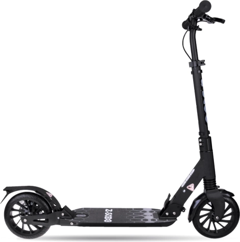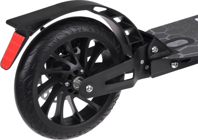 Această trotinetă urbană robustă se remarcă prin combinația de confort și siguranță. Frâna pe disc acționată manual, împreună cu frâna prin frecare din aripă și reflectorul, sporesc controlul și vizibilitatea. Suspensia atenuează denivelările și, împreună cu roțile mari, asigură o deplasare fluentă atât pe asfalt, cât și pe trotuare mai puțin uniforme.