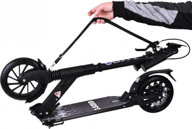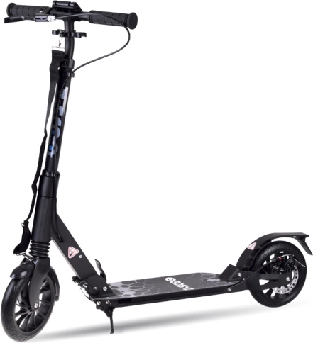 Mecanismul „one hand” permite plierea trotinetei în câteva secunde. Cureaua de umăr inclusă facilitează transportul în transportul public și pe scări.