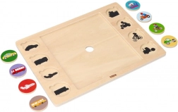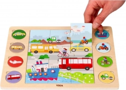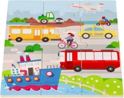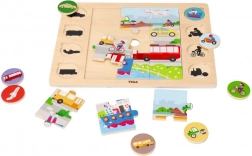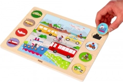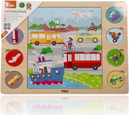 Datorită lemnului solid și marginilor netede, jocul este sigur de la 18 luni. Culorile vesele și formele clare atrag atenția și ajută la recunoașterea mai bună a mașinilor, autobuzelor, bărcilor, avioanelor și a altor mijloace de transport. După finalizare, copilul poate denumi vehiculele și le poate căuta în imaginea mare – o activitate excelentă pentru dezvoltarea vorbirii.