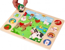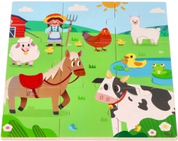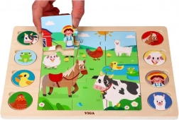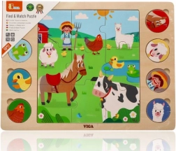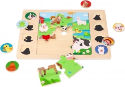 Acest puzzle ingenios îmbină două activități: mai întâi copiii asamblează imaginea centrală din 9 piese mari, apoi asociază 8 jetoane rotunde cu animale în umbrele corespunzătoare de pe planșă. Jocul susține în mod natural dezvoltarea vocabularului – după finalizare, copiii pot numi animalele și le pot căuta în imaginea mare a fermei.