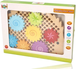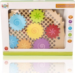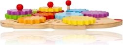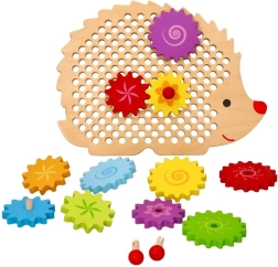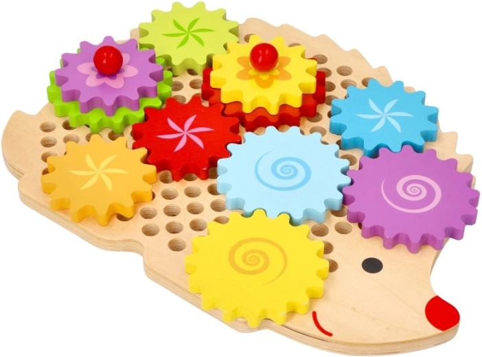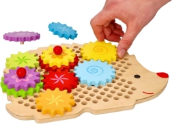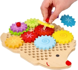 Puzzle din lemn în formă de arici, cu roți dințate viu colorate, care susține învățarea timpurie prin joacă. Copiii pot așeza roțile pe pini, încerca diferite combinații și urmări cum se rotesc toate. Aceasta dezvoltă gândirea logică și explică în mod natural principiile cauză–efect.