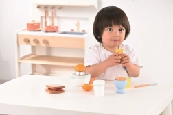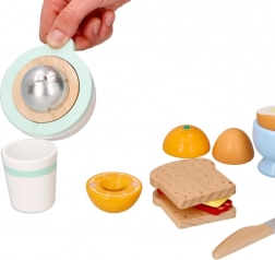 Set de mic dejun din lemn pentru micii bucătari, aduce totul pentru joacă realistă de gătit – toasturi, ou în suport, brânză, storcător manual cu portocală, ceașcă și un cuțit sigur din lemn. De la 24 de luni, susține motricitatea fină, creativitatea și jocurile de rol, având o execuție de calitate și durabilă.