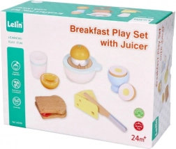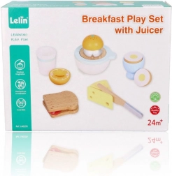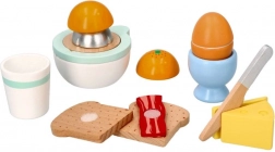 - Accesorii complete pentru micul dejun: toasturi, brânză, ou în suport, ceașcă, cuțit din lemn și storcător manual funcțional cu portocală.