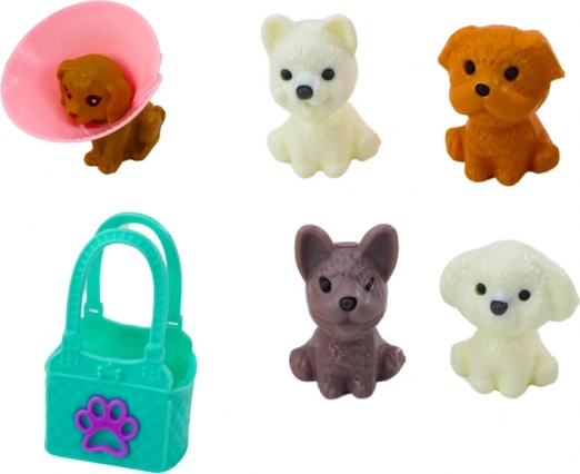Cățeluși de diferite culori și o geantă colorată cu motiv de lăbuță, ideale pentru transport și jocuri imaginative.