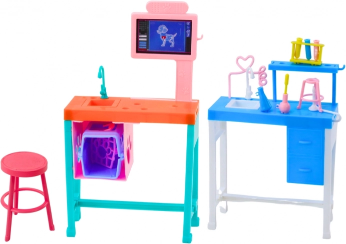 Clinica include un lavoar, un scaun și un computer pentru jocuri realiste de examinare și tratament al animalelor.