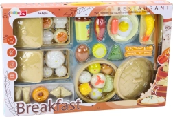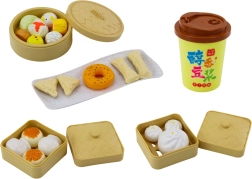 Acest set conține tot ce au nevoie mânuțele mici pentru a pregăti un mic dejun delicios imaginațional. Include recipiente colorate și funcționale pentru mâncare, o ceșcuță stilată pentru cafeaua de dimineață pentru a imita adulții, diverse tipuri de legume care pot fi tăiate și servite, gustări pregătite ce par reale, farfurii elegante și bețișoare pentru a învăța să mănânce în stil asiatic.