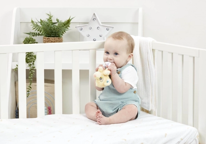 Plușul moale, paleta de culori naturale și dimensiunea compactă fac din zornăitoare prima jucărie ideală.