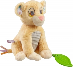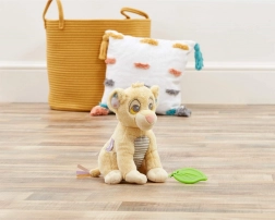 Puiul de leu adorabil SIMBA din povestea DISNEY Regele Leu este o jucărie activă din pluș moale, cu inel de dentiție în formă de frunză, burtică texturată și panglici senzoriale. Susține dezvoltarea simțurilor și a motricității fine, fiind ideală de la naștere, perfectă pentru alint și pentru primele jocuri.
