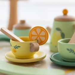 Oferiți-le copiilor un ritual de ceai magic cu un set elegant din lemn în nuanțe pastelate delicate. Setul este decorat cu motive fructate și florale și include ceainic, cești cu farfurioare, lingurițe, recipiente pentru lapte și zahăr, precum și o tavă mare cu mânere pentru transport ușor.