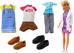 În pachet găsești mai multe ținute și pantofi, inclusiv șorț și haine de timp liber – transformare rapidă în coafeză, bucătăreasă sau îngrijitoare de animăluțe.