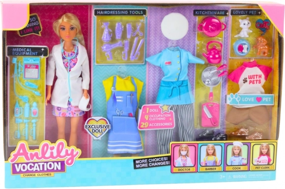 Păpușa ANLILY cu păr blond lung vine cu mai multe seturi de haine și accesorii tematice, pentru a se transforma în câteva clipe în doctoriță, coafeză, bucătăreasă sau îngrijitoare de animăluțe. Fiecare rol oferă scenarii de joc diferite și susține dezvoltarea abilităților sociale și a creativității.