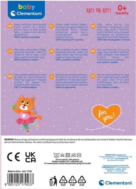 Pisicuța de pluș Katka de la Clementoni Baby este însoțitorul ideal pentru copiii mici. Este moale, colorată și plină de detalii atractive, care capturează atenția și sprijină dezvoltarea senzorială a bebelușilor.