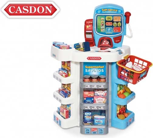Casă de marcat self-service pentru copii de la Casdon, stilată, transformă joaca de-a magazinul într-o experiență autentică: oferă sunete realiste, ecran tactil și afișaj electronic. Include terminal chip and pin, scanner, bancnote și monede, replici de alimente și coș de cumpărături. Înălțime 75 cm, potrivită de la 3 ani.