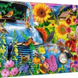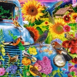Puzzle Idilă rurală: Păsări cântătoare prezintă o mașină veche înconjurată de păsări și flori. După asamblare, rezultă o imagine cu dimensiunile 683x480 mm.
