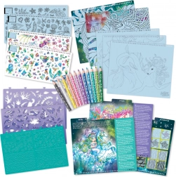- 250 de autocolante, 12 creioane colorate, 80 de șabloane, 35 de foi ilustrate, 4 forme din plastic, instrucțiuni pentru 12 tehnici de desen