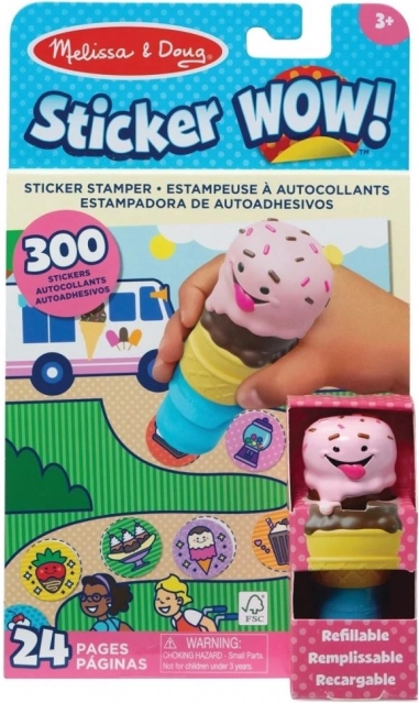 Cu setul Sticker WOW!, copiii își creează ușor propriile povești dulci: trebuie doar să apese ștampila și apare imediat un nou autocolant cu motiv de înghețată. Datorită depozitării ingenioase a autocolantelor în interiorul ștampilei, distracția este fără mizerie și mereu gata de folosire, fie acasă, în mașină sau la bunici.