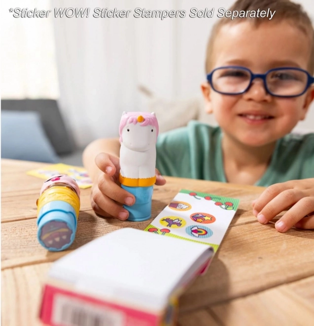 Set creativ pentru iubitorii de unicorni care include 200 de autocolante și o mini carte pentru creații fără sfârșit, acasă sau în călătorii. Rezervă universală compatibilă cu toate ștampilele din seria STICKER WOW!, stimulează imaginația și motricitatea fină. Produs sigur, cu certificare CE, distins cu titlul Jucăria anului 2024.
