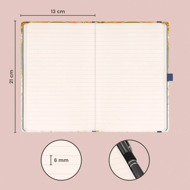 Caiet elegant dictat cu motivul Alfons Mucha – Muzica, cu coperți rigide, oferă închidere practică cu elastic, buclă pentru stilou și buzunar interior pentru mărunțișuri. În interior găsești 172 de pagini pe hârtie galbenă plăcută, ideal pentru jurnal, notițe de lucru și notarea ideilor.