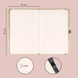 Buzunarul interior găzduiește mici obiecte, cărți de vizită sau autocolante. Hârtia galbenă cu structură punctată oferă utilizare universală – de la notițe la schițe și până la bullet journal. Liniatura asigură claritate și confort la scris acasă, la birou sau în călătorii.