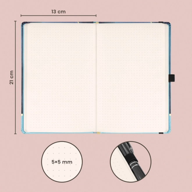 Caiet elegant cu motivul operei Alfons Mucha – Luna, cu coperți rigide. Oferă un layout punctat pentru notițe creative, închidere cu elastic, buzunar pentru mărunțișuri și buclă pentru creion. În interior are 172 de pagini din hârtie galbenă plăcută, de dimensiunea 13 × 21 cm – ideal pentru planificare, bullet journal și schițe.