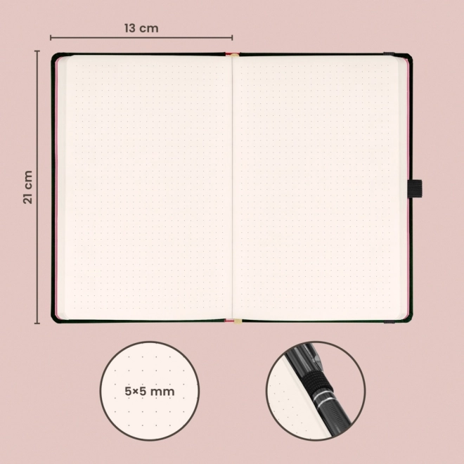 Paginile punctate oferă libertate pentru planificare precisă, desen și realizarea de notițe clare. Închiderea cu elastic păstrează totul laolaltă, buzunarul din spate ascunde mărunțișurile, iar bucla se asigură că veți avea întotdeauna stiloul la îndemână.