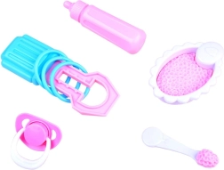 Setul include accesorii practice: bol cu piure, linguriță, suzetă, biberon și zornăitoare. Copiii pot hrăni, liniști și adormi bebelușul.