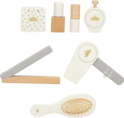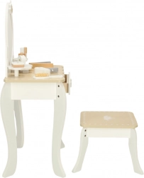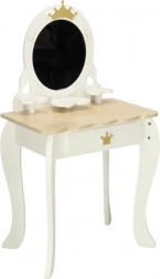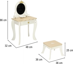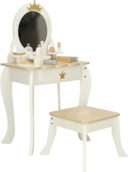 Măsuța este echipată cu o oglindă mare, rotundă, rafturi și un sertar pentru accesoriile cosmetice, plus un scăunel practic. Sunt incluse accesorii precum pieptăn, uscător de păr, placă de întins părul, paletă de farduri, parfum, lac de unghii și ruj. Toate accesoriile cosmetice sunt de jucărie, astfel încât nu există risc de murdărie.