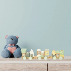 Piesele din lemn, șlefuite fin, cu vopsele pastelate netoxice și imprimeuri cu animăluțe, rezistă ani de joacă.