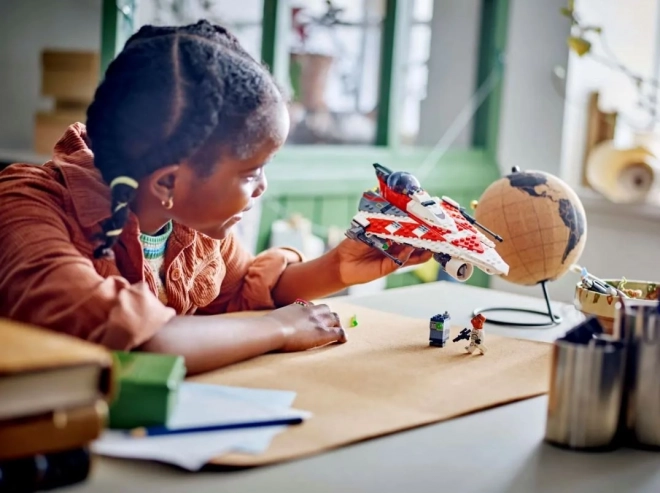 Asamblați din cărămizi LEGO mintea cu un cockpit care se deschide și tren de aterizare retractabil. Suporturile incluse pentru săbii sporesc jocul interactiv.