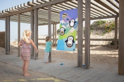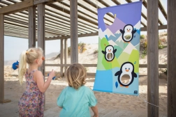 Transformați grădina, locul de joacă sau parcul într-o arenă plină de râsete și mișcare. Pânza colorată cu pinguini se prinde ușor cu frânghii de un copac sau de o structură, iar copiii pot începe să arunce „peștii” moi în deschiderile pregătite. Jocul dezvoltă în mod natural precizia, răbdarea și cooperarea în echipă.
