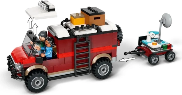 Mașina off-road găzduiește două minifigurine, are acoperiș detașabil, spate care se deschide și spații de depozitare ingenioase. Remorca oferă o antenă satelit rotativă, un microscop și ecrane.