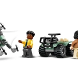 - Set de aventură – copiii care adoră vehiculele vor fi încântați de setul Jurassic World cu camion, remorcă, cușcă LEGO pentru dinozauri cu rampă de lansare și pereți, ATV și multe altele