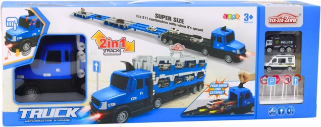 Descoperă setul 2‑în‑1 distractiv: un camion transportor robust, albastru, care, după deschidere, se transformă într-o pistă de curse lungă. Datorită efectelor de lumină și sunet, mașinuțelor de poliție la scară 1:64 și setului de indicatoare rutiere, copiii se pot bucura de ore întregi de joc creativ și curse pline de acțiune.