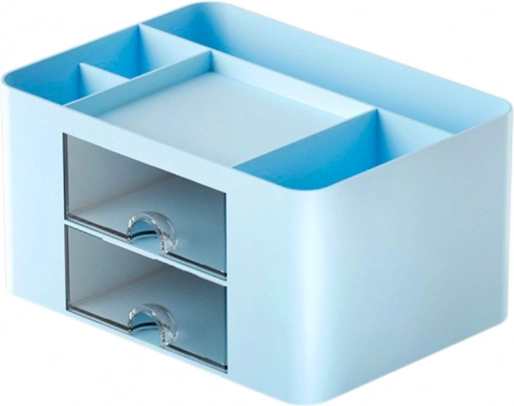 Organizatorul albastru oferă 5 compartimente și 2 sertare pentru diverse nevoi de organizare.