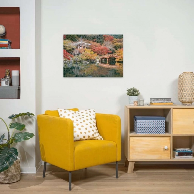 Paleta de toamnă în tonuri de roșu și portocaliu, cu podul tradițional și templul, creează un motiv care se asamblează cu plăcere și induce relaxare.